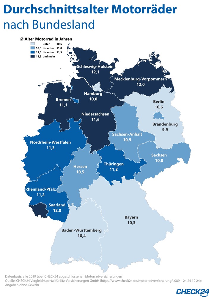 Mit den Lockerungen der Corona-Maßnahmen sind Motorradtouren jetzt wieder in allen Bundesländern erlaubt. Dabei sind Schleswig-Holsteiner auf den ältesten Motorrädern unterwegs. Im Schnitt haben die Maschinen dort 12,1 Jahre auf dem Buckel. Auch in Mecklenburg-Vorpommern und dem Saarland (jeweils Ø 12,0 Jahre) sind vergleichsweise alte Maschinen unterwegs. Brandenburger fahren mit durchschnittlich 9,9 Jahren die modernsten Zweiräder.