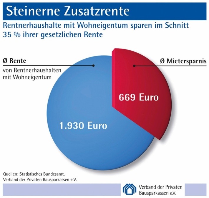 Berlin (ots) – Rentner, die in den eigenen vier Wänden wohnen, sparen im Schnitt monatlich 669 Euro Miete. Das entspricht rund 35 Prozent ihrer durchschnittlichen gesetzlichen Rente von 1.930 Euro pro Haushalt. Zu diesem Ergebnis kommt eine aktuelle Sonderauswertung* des Statistischen Bundesamtes im Auftrag des Verbandes der Privaten Bausparkassen.