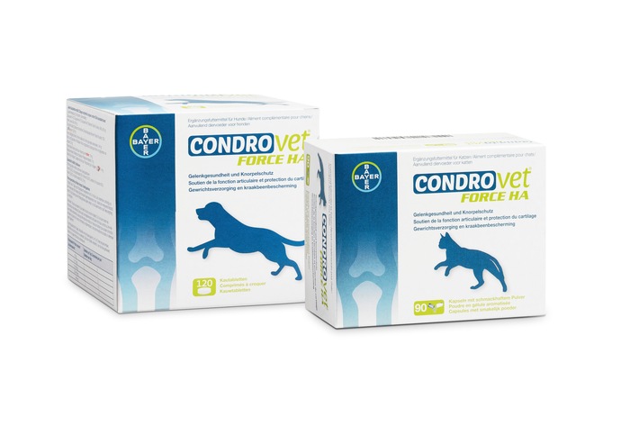 Leverkusen (ots) – Schon gewusst? Einer von fünf Hunden, die älter sind als ein Jahr, leidet an einer Osteoarthrose. Das sind schmerzhafte Gelenkbeschwerden, die durch eine zunehmende Zurückbildung des Gelenkknorpels verursacht werden und häufig Entzündungen an der Gelenkkapsel zur Folge haben. Dadurch schmerzen die Gelenke bei jeder Bewegung, was die Bewegungsfreude der Vierbeiner belastet. Auch etwa jede dritte Katze im Alter von 6 bis 7 Jahren weist degenerative Gelenksveränderungen auf. Bei Seniorkatzen ab 12 Jahren leiden sogar 9 von 10 Stubentigern unter schmerzhaftem Gelenkverschleiss. Viele Katzenhalter bemerken allerdings gar nicht, dass ihr Vierbeiner Schmerzen hat. Denn Katzen leiden häufig still und zeigen nur subtil, wenn ihnen etwas fehlt. Spezielle Nahrungsergänzungen wie das neue Condrovet® von Bayer können die Gelenkgesundheit und Bewegungsfreude betroffener Vierbeiner gezielt fördern.