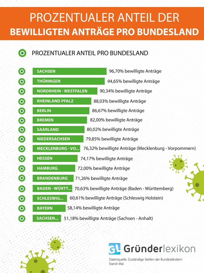 Das Gründerlexikon (https://www.gruenderlexikon.de/) ( https://www.gruenderlexikon.de/ ) hat die Klagen zum Anlass genommen und sich bei den zuständigen Stellen aller 16 deutschen Bundesländer über den Bearbeitungsstatus der Soforthilfe-Anträge informiert. Während Sachsen mit 96,70 Prozent fast alle der 73.808 bisher eingegangenen Anträge bearbeitet hat, sind es in Sachsen-Anhalt mit 51,18 Prozent gerade einmal etwas mehr als die Hälfte.