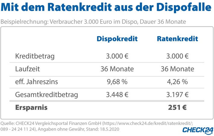 – Ausgleich des Girokontos per Ratenkredit spart 54 Prozent an Zinskosten – Dispoablösung durch Ratenkredit spart im Beispiel 251 Euro – Über 300 CHECK24-Experten beraten bei Fragen rund um den digitalen Kreditabschluss
