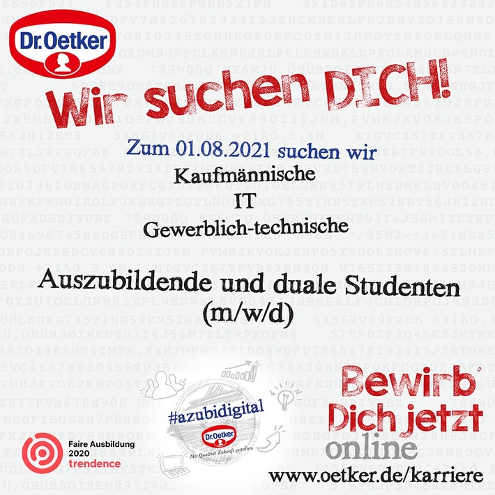Bielefeld (ots) – Was macht ein Kaufmann für Digitalisierungsmanagement (m/w/d)? Auf den Punkt gebracht: in die Digitalisierung von Geschäftsprozessen einsteigen und das aus einer ökonomisch-betriebswirtschaftlichen Perspektive. Diesen neuen Ausbildungsberuf und weitere spannende Ausbildungsberufe im kaufmännischen, gewerblich-technischen sowie im IT-Bereich bietet das in über 40 Ländern aktive Familienunternehmen Dr. Oetker an. Ab sofort können sich Schülerinnen und Schüler für das Ausbildungsjahr 2021 online unter http://www.oetker.de/karriere bewerben.