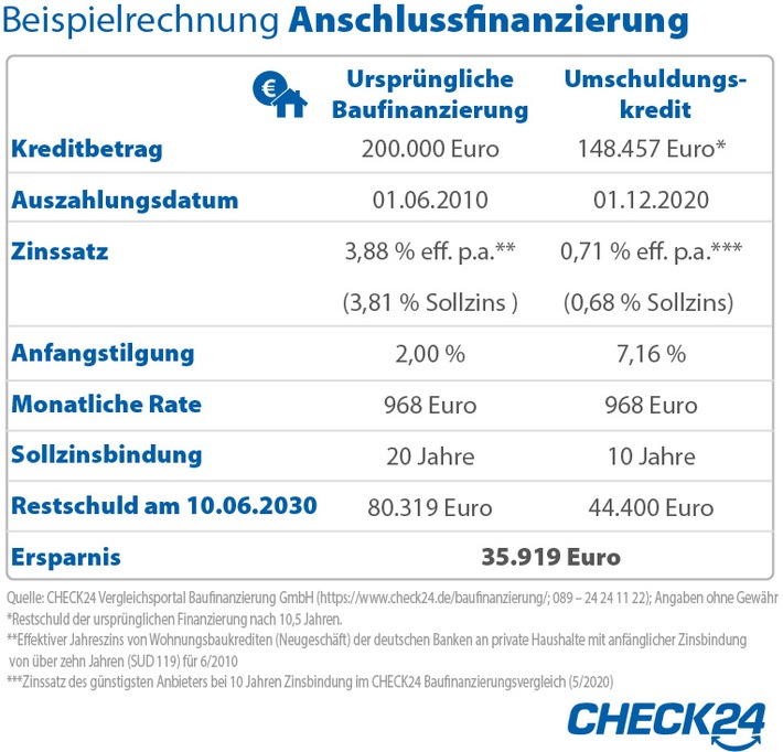 – Trotz laufender Finanzierung profitieren Verbraucher von niedrigen Bauzinsen – Umschuldung des Immobilienkredits spart im Beispiel 35.919 Euro – Bei CHECK24 beraten Baufinanzierungsspezialisten digital via Screensharing
