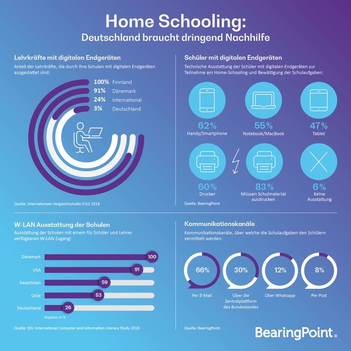 Die neue Studie von BearingPoint bestätigt die Ergebnisse der International Computer and Information Literacy Studie (ICILS) von 2018 (https://kw.uni-paderb orn.de/fileadmin/fakultaet/Institute/erziehungswissenschaft/Schulpaedagogik/ICIL S_2018__Deutschland_Presseinformation.pdf) , nach dem Deutschland beim Einsatz digitaler Medien fürs Lernen international Schlusslicht ist. Viele Eltern sehen es als sehr notwendig an, dass die deutschen Schulen auch unabhängig von der aktuellen COVID-19-Krise ihr Angebot an digitalen Lehrinhalten deutlich erweitern.
