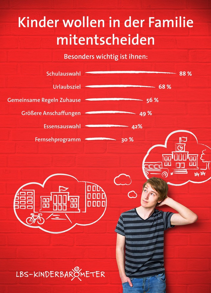 Berlin (ots) – Kinder wollen bei Entscheidungen in der Familie mitreden. Am wichtigsten ist ihnen dabei die Wahl der Schule (88 %), hat das LBS-Kinderbarometer herausgefunden. Auch über das nächste Urlaubsziel (68 %) und die Regeln des Zusammenlebens zuhause (56 %) wollen sie gemeinsam mit den Eltern entscheiden.