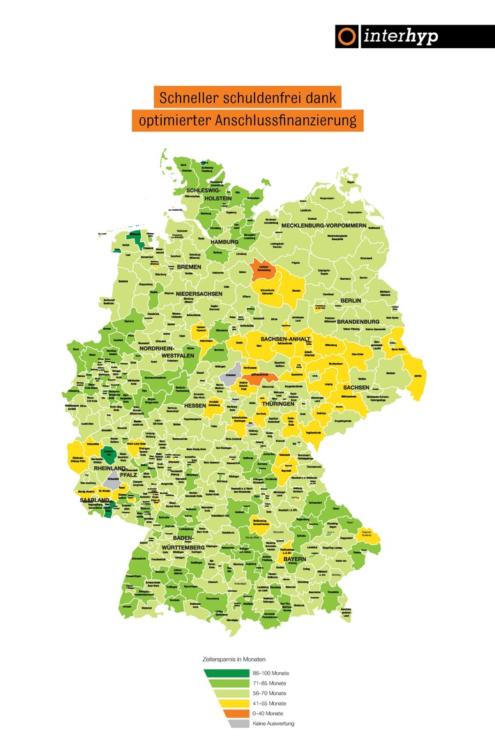 Interhyp zeigt das zeitliche Einsparpotenzial bei der Anschlussfinanzierung in den Landkreisen in einer großen Deutschlandkarte auf. Es reicht von zwei Jahren und elf Monaten im Kyffhäuserkreis bis zu sieben Jahren und zehn Monaten in Emden.