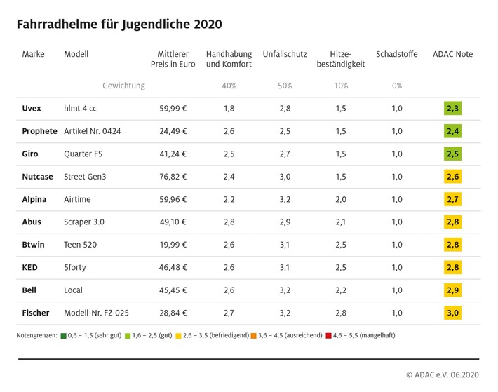 Die ausführlichen Ergebnisse aller im ADAC-Fahrradhelmtest geprüften Modelle finden Sie unter http://www.adac.de/helmtest