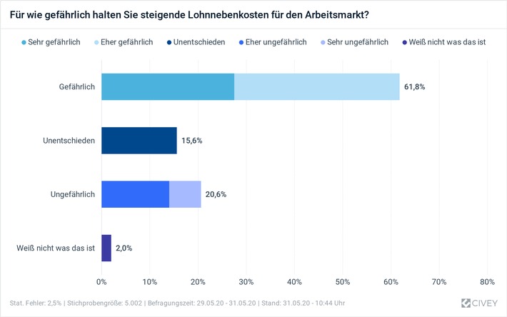 Berlin (ots) – Aktuell geht jeder fünfte Fall von Arbeitslosigkeit auf das Konto der Corona-Pandemie. Tendenz weiter steigend. Die drastisch steigenden Ausgaben der Sozialkassen drohen durch Beitragssteigerungen den Arbeitsmarkt zusätzlich zu belasten. Diese Gefahr sieht auch eine groÃe Mehrheit der Bürgerinnen und Bürger. Laut einer aktuellen Civey-Umfrage (http://link.mediaoutreach.meltwater. com/ls/click?upn=A-2Fi-2FVVp-2B-2FgJrcqF5n7MUv-2BaidF8yq6bErgaxhnq8psbQzmlmvfpFk msvSR2BpD1ht6mF_r5rOVA-2FnFnbzUEN99GXvs2-2F3Kt-2Bit5H-2B9DwcYCMZL-2BG-2F6Keo78ou Tvfunbzpss4c38ta5xsDwMTM-2FxZuh9g91u4rgu0q2hacwyRqVUF4yuyBZWUc0qXdWfePdIZACdmPW2 eqAXMjlCnVj62XGIO1VjOtAZbt9RlUunQkTG9EIPTivQVgpXn1cin9m-2ByNQ-2B4jA9XHevMRdU8Lqp 4a7A2LtCCrw2ZAyPYwNaPsdsjWLtlxDFPf3qeX6x7uF5UJGm6fU-2BRC1H1DExmXtCd-2FTJCdF9UumR zOaVwkkZREZ7V3nhtD-2F6eNvvmHzJkcy9rntH2r3rQ-2BEe8ENztL9lQbzr8HPX7txjGUs0H8DDSiRE f-2Bgr8jHWb2IHk9-2FhjEPviFPSaXWguspr1iqlKBG21U-2B68Z4A-3D-3D) halten 62 Prozent steigende Lohnnebenkosten für gefährlich, während nur 21 Prozent steigende Lohnnebenkosten für ungefährlich halten.