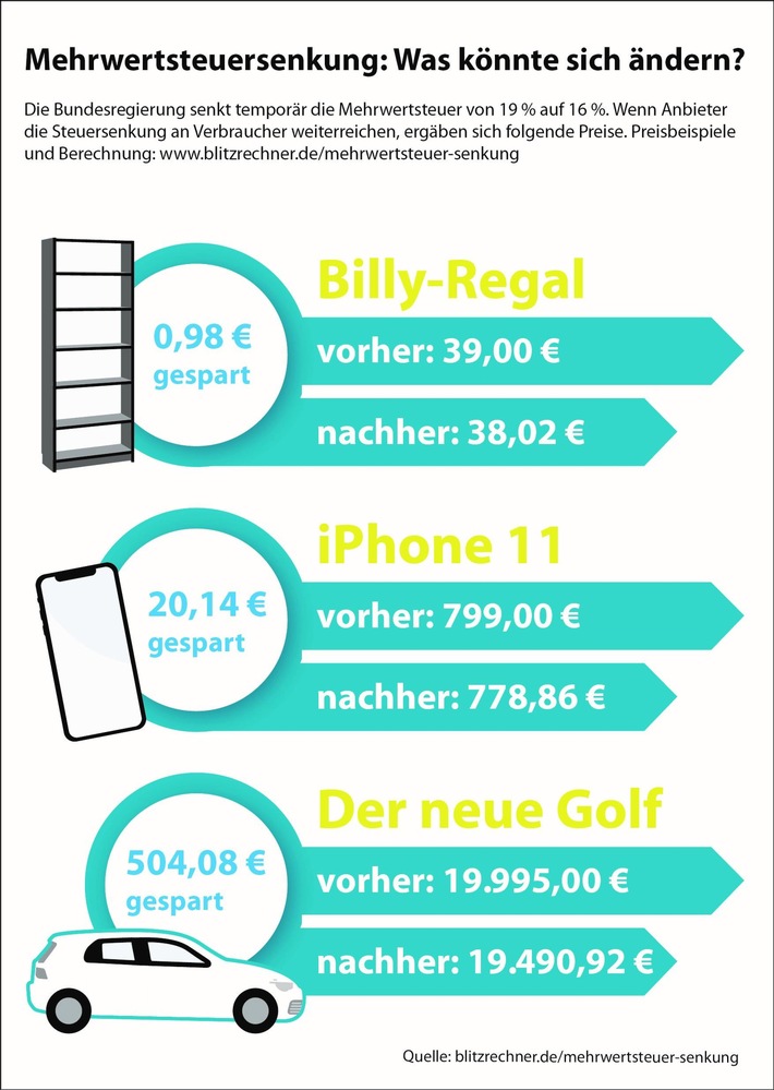 Berlin (ots) – Ab dem 1. Juli sinkt die Mehrwertsteuer temporär bis zum Jahresende von 19 Prozent auf 16 Prozent. Die Mehrwertsteuersenkung ist Teil des riesigen MaÃnahmenpakets, mit dem die Bundesregierung die Konjunktur ankurbeln und die wirtschaftlichen Folgen der Corona-Pandemie abfedern will. Doch wie wirkt sich die Mehrwertsteuersenkung auf Preise von Konsumgütern aus? Wieviel könnten Konsumenten einsparen? Mit einem kostenfreien Online-Rechner auf Blitzrechner.de können Auswirkungen durchgespielt und die neuen Preise ermittelt werden: https://www.blitzrechner.de/mehrwertsteuer-senkung/ .