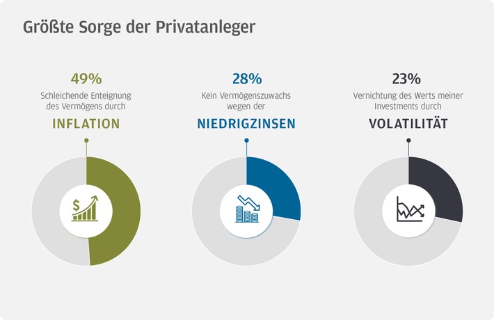 In Bezug auf ihre Ersparnisse bereitet den befragten Deutschen derzeit die größten Sorgen, dass ihr Sparguthaben durch die Inflation sukzessive entwertet wird – mit 49 Prozent sieht fast jeder Zweite dies als Gefahr für sein Vermögen an. Mit 28 Prozent hat zudem rund ein Drittel der Befragten erkannt, dass sich im Niedrigzinsumfeld das Ersparte nicht vermehrt – und dass hier Handlungsbedarf bestehen könnte. Mit 23 Prozent ist zudem rund jeder vierte Befragte besorgt, dass das Auf und Ab an der Börse den Wert der Investments vernichtet. „Derzeit ist häufig von der Inflationsgefahr die Rede, wenn die Konjunktur wieder anzieht und noch ‚viel billiges Zentralbankgeld im Markt‘ ist“, so Schulz. Viel gefährlicher sei für Sparer aber die schleichende Enteignung, wenn die Sparzinsen dauerhaft unter der Inflationsrate liegen.