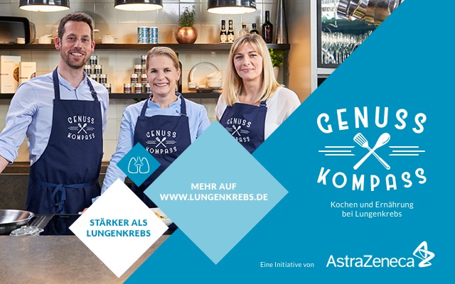 Mit der neuen Themenwelt „GenussKompass“ erweitert AstraZeneca das bestehende Service-Angebot der Initiative „Stärker als Lungenkrebs“, die Betroffene und Angehörige insbesondere in der schwierigen Situation nach der Diagnosestellung bestmöglich begleiten und Mut machen möchte. Neben dem Thema Ernährung finden sich auf der Internetseite http://www.lungenkrebs.de wichtige Informationen zum Leben mit der Erkrankung, eine Übersicht über hilfreiche Anlaufstellen und mehrsprachige Patientenratgeber zum Herunterladen. Darüber hinaus ist ein Expertenrat vorhanden, in dem Fragen von Betroffenen und Angehörigen beantwortet werden. Eine weitere wichtige Säule der Initiative ist die Internetseite http://www.teste-deinen-lungenkrebs.de , die den Fokus auf die tumorbiologische Testung bei Lungenkrebs legt. Diese spielt eine entscheidende Rolle bei der Wahl der individuell bestmöglichen Therapie von Betroffenen. Auf der Internetseite finden Interessierte die wichtigsten Informationen zur Testung sowie eine Checkliste für das Arztgespräch. Abgerundet wird das Serviceangebot der Initiative durch den Facebook-Kanal „Stärker als Lungenkrebs“ mit hilfreichen Alltagstipps und Möglichkeiten für den Austausch von Betroffenen und Angehörigen untereinander.