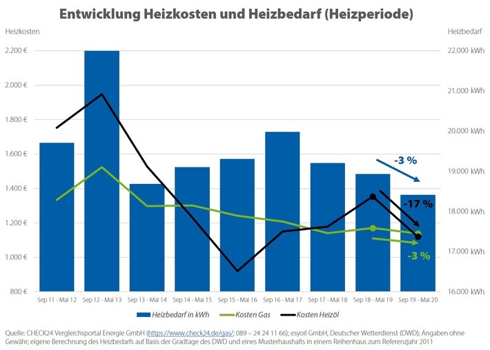 Der Heizölpreis (https://www.check24.de/heizoel/heizoelpreise/) hat fast ein Zehn-Jahres-Tief erreicht. Kunden mit Ölheizung konnten sich darum in der aktuellen Heizperiode freuen: Zwischen September 2019 und Mai 2020 zahlten sie 17 Prozent weniger fürs Heizen als im Vorjahreszeitraum.* Allein am niedrigeren Heizbedarf liegt das nicht: der ist zwar zum dritten Mal in Folge gesunken, allerdings nur um drei Prozent.