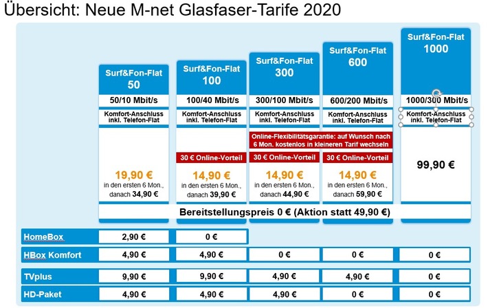 Um die Komplexität im Sortiment zu verringern, hat jeder Tarif im Gigabit Portfolio 2020 ab sofort den Komfort-Anschluss mit Telefon-Flat inklusive. Der Vorteil: Der Anschluss bietet zusätzliche Leistungen wie zwei Leitungen (Sprachkanäle), standardmäßig drei Rufnummern (auf Wunsch erweiterbar auf bis zu 10 Rufnummern) und zusätzliche Leistungsmerkmale wie Anklopfen, Rückfrage/Makeln und Dreierkonferenz. Für den Komfort-Anschluss empfiehlt M-net die HomeBox Komfort. Sie ist mit den Surf&Fon-Flat Tarifen 300 und 600 ohne Zusatzkosten erhältlich und kostet im Tarif Surf&Fon-Flat 100 nur 4,90 Euro zusätzlich pro Monat.