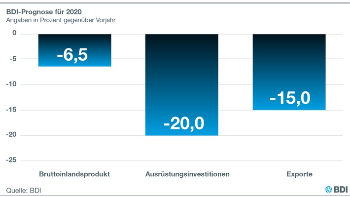 Die Corona-Krise trifft die Wirtschaft weltweit mit voller Wucht. Dies wird in diesem Jahr zu einem Minus der deutschen Exporte um etwa 15 Prozent und zu einem Rückgang der Importe um ungefähr zwölf Prozent führen. Bei Ausrüstungsinvestitionen rechnet der BDI mit einem Einbruch von rund 20 Prozent. Den privaten Konsum erwarten wir mit sieben Prozent im Minus.