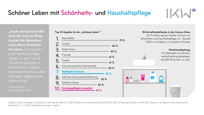 Unabhängig von der Corona-Krise gilt: Schönheits- und Haushaltspflegeprodukte gehören für Menschen in Deutschland zu einem „schönen Leben“ dazu. Dieses beinhaltet vor allem Gesundheit, Familie, Partnerschaft und Freunde, ein gepflegtes Aussehen und ein schönes/sauberes Zuhause.