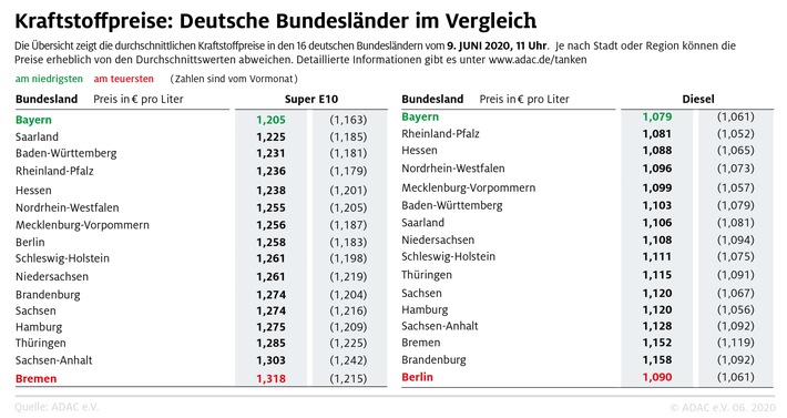 München (ots) – Die regionalen Preisunterschiede bei Benzin und Diesel haben deutlich zugenommen. Während Autofahrer in Bayern laut aktuellem Bundesländervergleich Super E10 für durchschnittlich 1,205 Euro je Liter tanken können, müssen sie in Bremen für den Liter im Mittel 1,318 Euro bezahlen. Das sind immerhin 11,3 Cent mehr als in Bayern. Eine 50-Liter-Tankfüllung ist dadurch im norddeutschen Stadtstaat im Schnitt um 5,65 Euro teurer. Noch im April lag die mittlere Preisdifferenz zwischen billigstem und teuerstem Bundesland bei lediglich 7,9 Cent je Liter.
