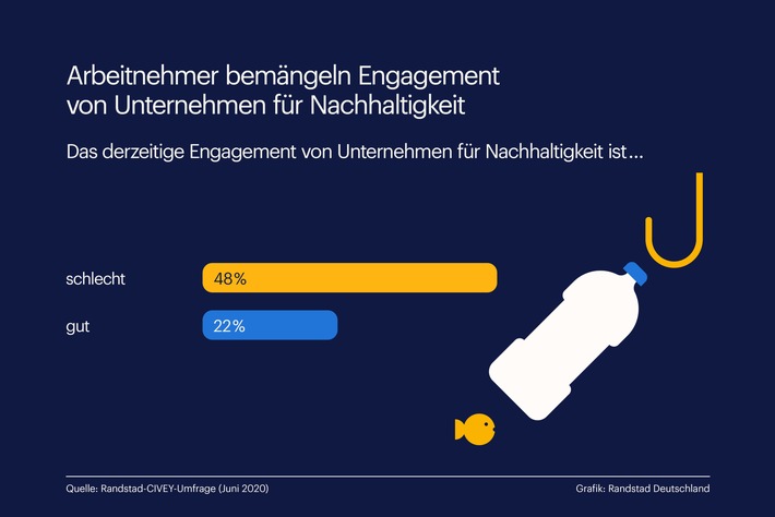 Dies macht das tagesaktuelle Stimmungsbild der Randstad-CIVEY-Umfrage zum Thema Nachhaltigkeit deutlich. Demnach beurteilt die Hälfte der deutschen Arbeitnehmer das derzeitige Engagement deutscher Unternehmen für Nachhaltigkeit als unzureichend (50%). Tendenz der vergangenen Wochen: leicht steigend. Kurz zuvor hatte der Großteil deutscher Unternehmen in der Randstad-ifo-Personalleiterbefragung angegeben, bereits Maßnahmen für ökologisch und sozial verantwortliches Wirtschaften ergriffen zu haben (86%). „Aktuell zählt für viele Unternehmen vor allem das kurzfristige Ziel des wirtschaftlichen Überlebens. Dabei gilt es jedoch, langfristige Antworten auf bleibende Herausforderungen zu finden. Nur wer nachhaltig denkt und agiert, kann Maßnahmen entwickeln, die auf die langfristige Entwicklung von Unternehmen und Wirtschaft einzahlen“, erklärt Carlotta Köster-Brons, CSR-Beauftragte von Randstad Deutschland.