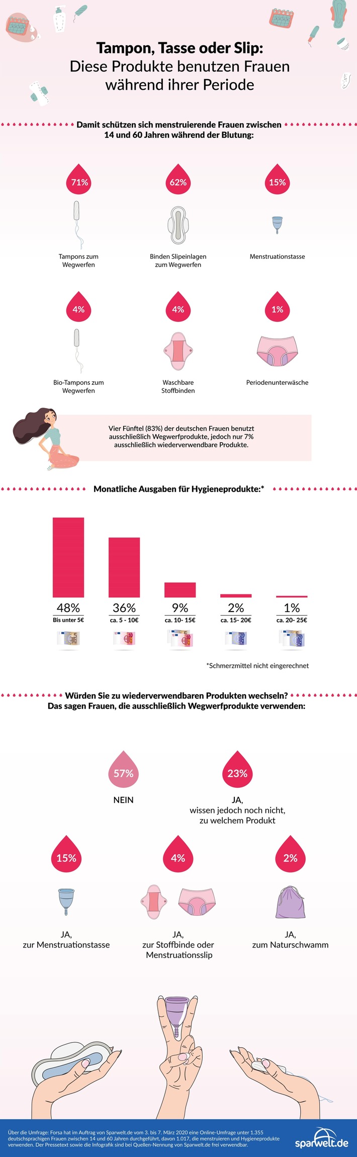 Über die Umfrage : Forsa hat im Auftrag von Sparwelt.de vom 3. bis 7. März 2020 eine Online-Umfrage unter 1.355 deutschsprachigen Frauen zwischen 14 und 60 Jahren durchgeführt, davon 1.017, die menstruieren und Hygieneprodukte verwenden. Der Pressetext sowie die Infografik sind bei Quellen-Nennung von Sparwelt.de frei verwendba r.