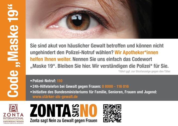 Die Union deutscher Zonta Clubs ruft bundesweit alle Apotheken, Arztpraxen und Kliniken auf, sich sichtbar an „Code Maske 19“ zu beteiligen und von häuslicher Gewalt Betroffenen die zusätzliche Notrufhilfe anzubieten.