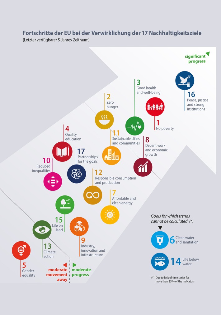 Bei acht Nachhaltigkeitszielen hat die EU in den letzten fünf Jahren insgesamt moderate Fortschritte erzielt. Solche moderaten Trends sind sichtbar für SDG 11 „Nachhaltige Städte und Gemeinden“, SDG 4 „Hochwertige Bildung, SDG 17 „Partnerschaft zur Erreichung der Ziele“, SDG 12 „Nachhaltige/r Konsum und Produktion“, SDG 7 „Bezahlbare und saubere Energie“, SDG 10 „Weniger Ungleichheiten“, SDG 15 „Leben und Land“ und SDG 9 „Industrie, Innovation und Infrastruktur“.