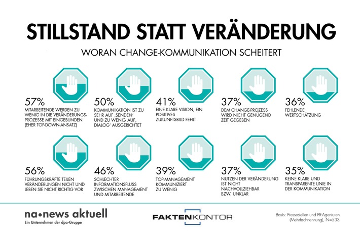 Hamburg (ots) – Die kommunikative Begleitung von Veränderungsprozessen wird in Zukunft viel wichtiger werden. Derzeit gibt es bei Change-Kommunikation aber noch einige Hürden zu überwinden, allen voran eine unzureichende Integration und Interaktion sowie mangelnder Dialog. Zu diesem Ergebnis kommt eine aktuelle Umfrage von news aktuell und Faktenkontor. Die dpa-Tochter und Faktenkontor haben bei Fach- und Führungskräften aus der PR-Branche nachgefragt, was die wichtigsten Gründe für ein Scheitern von Change-Kommunikation sind. 533 Kommunikatoren aus Deutschland haben an der Befragung teilgenommen.