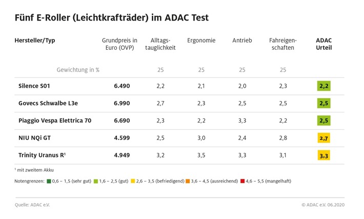 München (ots) – Kaum ein anderes Fahrzeug ist so gut geeignet wie der Roller, um sich im urbanen Umfeld elektrisch fortzubewegen. Portable Akkus bzw. stadttaugliche Reichweiten lassen die Verkaufszahlen der E-Motorroller stetig steigen. Aus diesem Grund hat der ADAC fünf Modelle, die mit der Führerscheinklasse A1 („125 ccm“) zu fahren sind, getestet. Dabei standen Alltagstauglichkeit, Ergonomie, Antrieb und Fahreigenschaften im Fokus. Das erfreuliche Ergebnis: Kein Roller ist durchgefallen. Allerdings konnte auch kein Modell mit der Bestnote „sehr gut“ überzeugen. Zwei der getesteten Roller schnitten befriedigend ab, drei lieferten gute Ergebnisse.