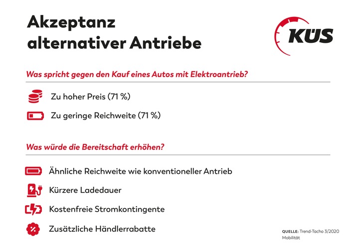 Der Trend-Tacho wird für die Prüforganisation KÜS und das Fachmagazin kfz-betrieb vom Kölner Institut BBE Automotive GmbH erstellt. Es handelt sich um eine Mixed-Mode-Befragung, telefonisch (CATI) von 300 Personen und online (CAWI) von 700 Personen. Zielpersonen sind Pkw-Fahrer, die im Haushalt für Fragen rund um das Auto mitverantwortlich sind. Die Befragung wurde im Mai 2020 durchgeführt. Die Gewichtung der Befragungsergebnisse erfolgt mit den KBA-Daten (Bestandsanteile Pkw-Marken, Alterssegmente).