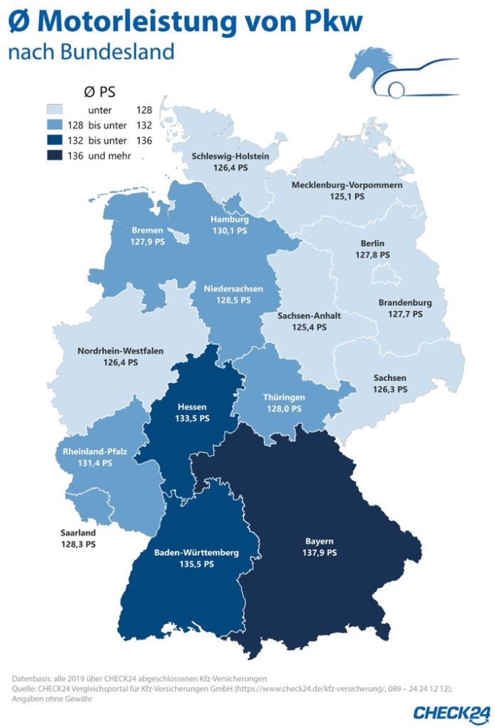 „Dass Bayern die Auswertung der PS-Hochburgen anführt, verwundert kaum“ , sagt Dr. Tobias Stuber, Geschäftsführer Kfz-Versicherungen bei CHECK24. „Immerhin haben dort gleich zwei große deutsche Autobauer ihren Hauptsitz, die für hochmotorisierte Fahrzeuge bekannt sind. Gleichzeitig verfügen die Bayern über die größte Kaufkraft in Deutschland und leisten sich dadurch wohl häufiger einen PS-starken Pkw.“