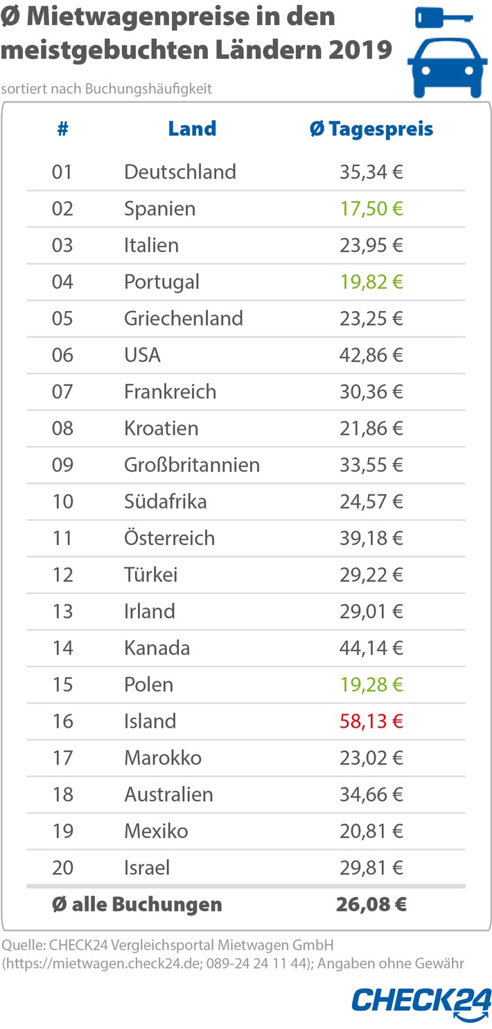 17,50 Euro pro Tag. Auch in Portugal (Ø 19,82 Euro) und Polen (Ø 19,28 Euro)