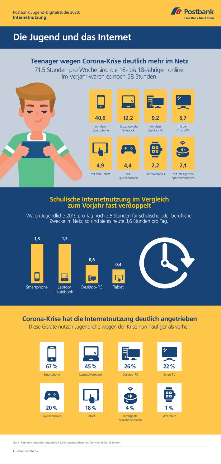 Sie lesen gerade: 2020 Postbank Jugend-Digitalstudie / Studie: Teenager verbringen durch Corona-Krise deutlich mehr Zeit im Netz / 16- bis 18-Jährige surfen mehr als 70 Stunden pro Woche
