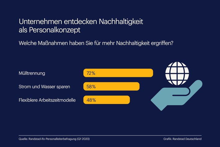 Die hier vorgestellten Ergebnisse stammen aus der Randstad-ifo-Personalleiterbefragung (https://www.randstad.de/fuer-unternehmen/w issenswertes/randstad-ifo-Personalleiterbefragung) Q1 2020, die quartalsweise durch das ifo-Institut im Auftrag vom Personaldienstleister Randstad durchgeführt wird. Die Studie befragt bis zu 1000 Personalverantwortliche in deutschen Unternehmen unterschiedlicher Größen und Branchen. Die Sonderfrage im ersten Quartal 2020 bezog sich auf Nachhaltigkeit in Deutschlands Unternehmen.