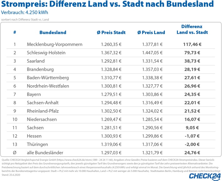 Verbraucher, die in ländlichen Gebieten leben, müssen mehr für Strom bezahlen als in Städten. Den größten Unterschied gibt es in Mecklenburg-Vorpommern. Im Durchschnitt unterscheiden sich die Stromkosten (https://www.check24.de/strom/stromkosten/) zwischen Stadt und Land dort um neun Prozent. Für 4.250 kWh bezahlen Stadtbewohner durchschnittlich 1.260 Euro pro Jahr. Für Landbewohner kostet die gleiche Menge Strom im Durchschnitt 117 Euro mehr.*
