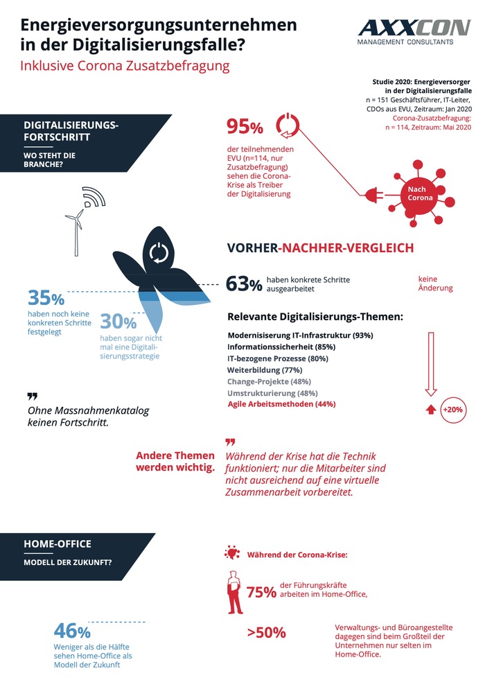 Für die Studie „Energieversorgungsunternehmen in der Digitalisierungsfalle“ der Unternehmensberatung AXXCON wurden 151/114 Geschäftsführer, IT-Verantwortliche und Chief Digital Officer deutscher Energieversorger befragt. Durchgeführt wurde die telefonische Umfrage im Januar/Mai 2020.