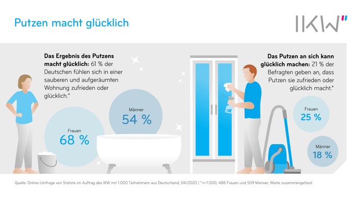 Frankfurt (ots) – Ein sauberes Zuhause sorgt für Wohlbefinden. Laut einer im April 2020 durchgeführten Statista-Umfrage im Auftrag des IKW* halten 96 Prozent der Befragten ein sauberes Zuhause für sehr wichtig. Hierbei geht es ihnen vor allem darum, sich in den eigenen vier Wänden wohlzufühlen. Die beliebteste Tätigkeit ist Staubsaugen, gefolgt vom Wäschewaschen – Männer und Frauen haben allerdings unterschiedliche Favoriten.