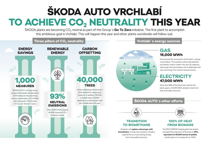 Als erster SKODA AUTO Fertigungsstandort weltweit wird das Komponentenwerk Vrchlabí noch dieses Jahr CO2-neutral produzieren. Die größten Kohlendioxid-Einsparungen ermöglichte die konsequente Umstellung des Hightech-Werks auf erneuerbare Energien – die CO2-Emissionen konnten so von ursprünglich 45.000 Tonnen pro Jahr auf aktuell noch 3.000 Tonnen reduziert werden. In einem nächsten Schritt werden nun auch die verbliebenen Emissionen mithilfe weiterer Kompensationsmaßnahmen sowie über Kompensationszertifikate ausgeglichen