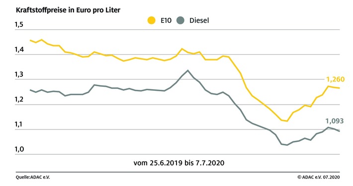 München (ots) – Die Kraftstoffpreise an den deutschen Tankstellen sind im Vergleich zur Vorwoche leicht gesunken. Laut aktueller ADAC Auswertung ging der Preis für einen Liter Super E10 im Vergleich zur Vorwoche um 0,9 Cent je Liter auf derzeit 1,260 Euro zurück. Diesel verbilligte sich im selben Zeitraum um 0,6 Cent und kostet aktuell im bundesweiten Durchschnitt 1,093 Euro je Liter.