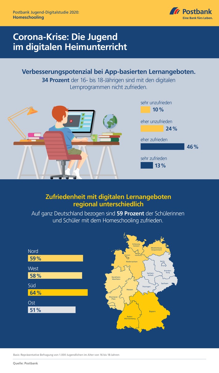 In der Corona-Krise stellen deutsche Jugendliche ihren Schulen ein uneinheitliches Zeugnis aus. Während jeder dritte Teenager mit den Online-Lernangeboten seiner Schule unzufrieden ist, schauen 59 Prozent der 16- bis 18-Jährigen positiv auf die digitalen Lernangebote ihrer Schulen. Dies sind Ergebnisse der repräsentativen Postbank Jugend-Digitalstudie 2020, für die 1.000 Jugendliche im Alter zwischen 16 und 18 Jahren befragt wurden.