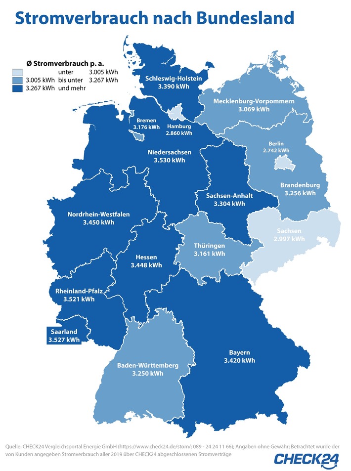 Verbraucher in Niedersachsen, im Saarland und in Rheinland-Pfalz verbrauchen am meisten Strom. Im Durchschnitt benötigen sie jeweils knapp über 3.500 kWh pro Jahr und damit rund 28 Prozent mehr als Verbraucher in Berlin (Ø 2.742 kWh). Im Bundesdurchschnitt geben CHECK24-Kunden einen jährlichen Stromverbrauch (https://www.check24.de/strom/stromverbrauch/) von 3.332 kWh an.*