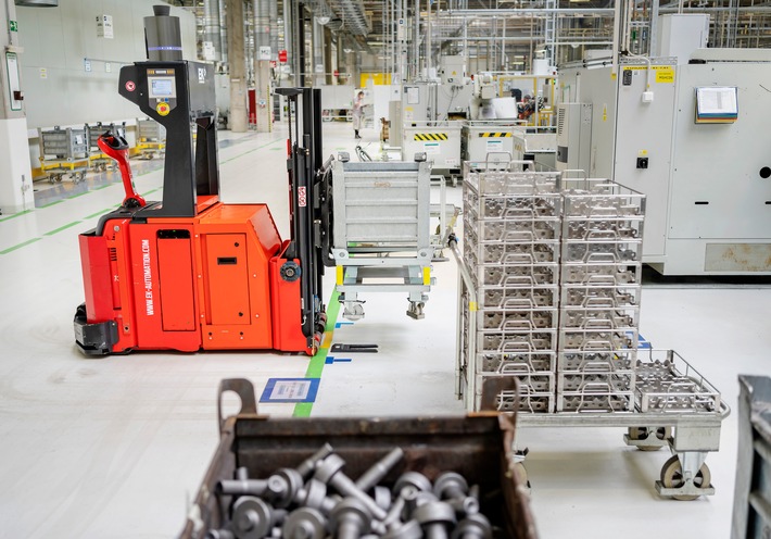 Die Teileversorgung der CNC-Bearbeitungslinien in der Produktion verläuft jetzt automatisch. Logistikmitarbeiter stellen im Lager einen Ladungsträger mit den benötigten Teilen bereit. Ein automatischer Transportroboter holt ihn ab und bringt ihn zu einer der CNC-Bearbeitungslinien. Geleitet wird der Roboter dabei von IoT-Sensorik. Auf dem Rückweg nimmt der Roboter einen leeren Ladungsträger mit, der sich automatisch im Teilelager zurückmeldet.