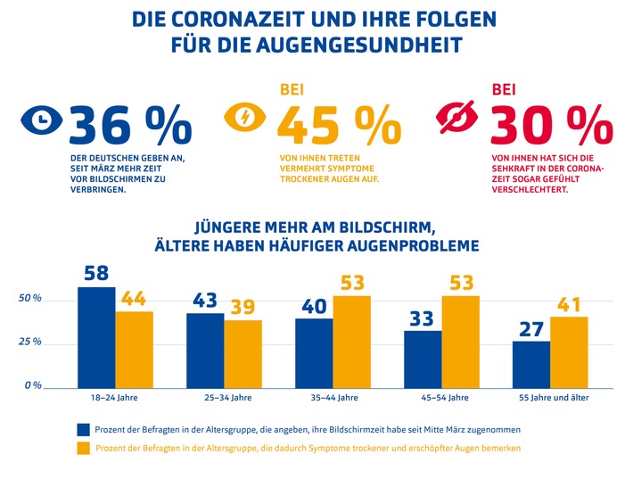 Schwabach (ots) – Home-Office, Serienmarathons und digitale Verabredungen: nichts prägte die Zeit des Corona-Lockdowns so sehr wie die Nutzung digitaler Medien. Eine Entwicklung mit Folgen: Rund ein Drittel derer, die mehr Zeit vor den Bildschirmen verbrachten, klagen jetzt über eine Verschlechterung der Sehleistung und fast die Hälfte über erschöpfte und / oder brennende Augen.