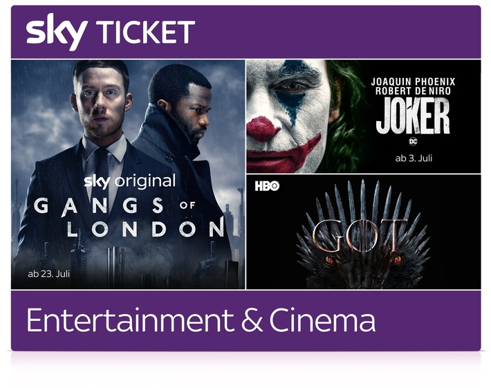 – Filme & Serien erstmals zusammen in einem Ticket: preisgekrönte Sky Originals, exklusive HBO-Serien und aktuelle Blockbuster für nur 14,99 Euro als Erste streamen – Ganz einfach testen: Neukunden genießen im ersten Monat einen Preisvorteil von 25 Prozent – Noch einfacher und komfortabler: optimierte Benutzeroberfläche, vereinfachter Buchungsprozess und eine verbesserte Download-Funktion – Exklusive Serien und neueste Kinoblockbuster zum Start auf Sky Ticket verfügbar: „Gangs of London“ (ab 23. Juli), „Perry Mason“ und „Rick & Morty“, sowie „Joker“, „Der Fall Collini“ und „Zombieland – Doppelt hält besser“