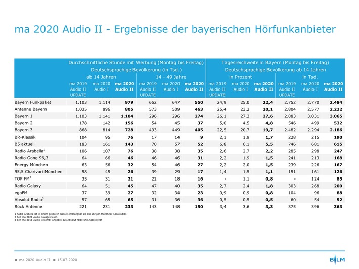 München (ots) – Lokale Sender zu hören macht Spaß – das belegen die heute veröffentlichen Daten der Media-Analyse 2020 Audio II: Demnach sind die bayerischen Lokalradios in der werberelevanten Zielgruppe der 14- bis 49-Jährigen die klare Nummer eins im Freistaat. So kommt das Bayern Funkpaket auf 550.000 Hörerinnen und Hörer in der Durchschnittsstunde, vor den landesweiten Sendern Antenne Bayern mit 463.000, Bayern 3 mit 405.000 und Bayern 1 mit 274.000.