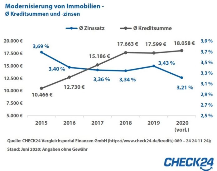 *Datenbasis: alle seit 2015 über CHECK24 abgeschlossenen Ratenkredite mit Verwendungszweck Modernisierung ungeachtet der Laufzeit oder eines Merkmals auf der Seite des Kreditnehmers; Stand: Juni 2020