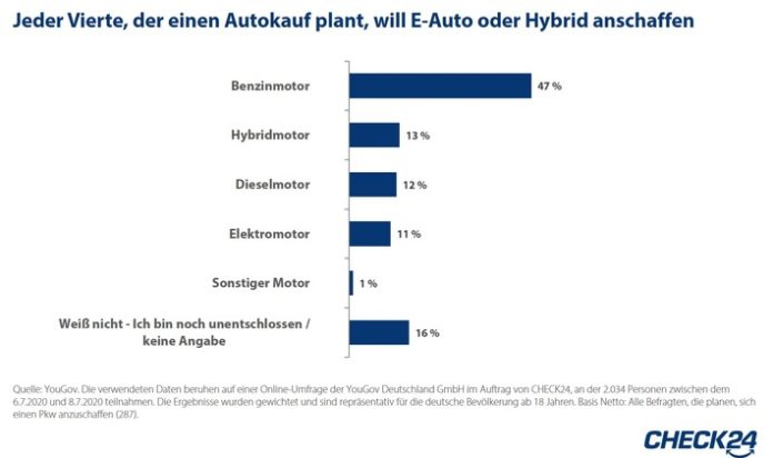 1)Die verwendeten Daten beruhen auf einer Online-Umfrage der YouGov Deutschland GmbH im Auftrag von CHECK24, an der 2.034 Personen zwischen dem 6.7.2020 und 8.7.2020 teilnahmen. Die Ergebnisse wurden gewichtet und sind repräsentativ für die deutsche Bevölkerung ab 18 Jahren. Basis Netto: Alle Befragten, die planen, sich einen Pkw anzuschaffen (287)