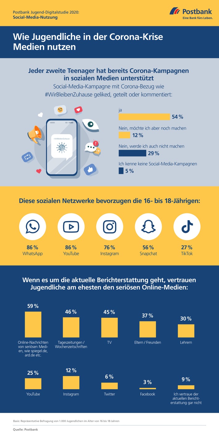 Postbank Jugend-Digitalstudie 2020 / Studie: Jeder zweite Jugendliche unterstützt Corona-Kampagnen in sozialen Medien / WhatsApp, YouTube und Instagram sind unter Teenagern am beliebtesten