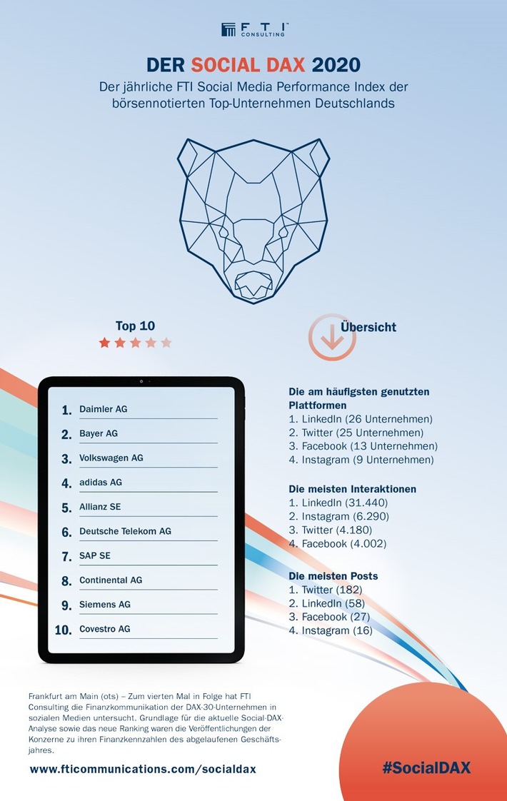 – Daimler, Bayer und Volkswagen führen 2020 das Social-DAX-Ranking von FTI Consulting an – Live- und Bewegtbild-Formate klar favorisiert – begünstigt auch durch den Pandemie-Kontext – LinkedIn steigt zur Plattform Nummer 1 für die Jahresberichterstattung auf – Nachhaltigkeitsthemen verstärkt in die Finanzkommunikation integriert