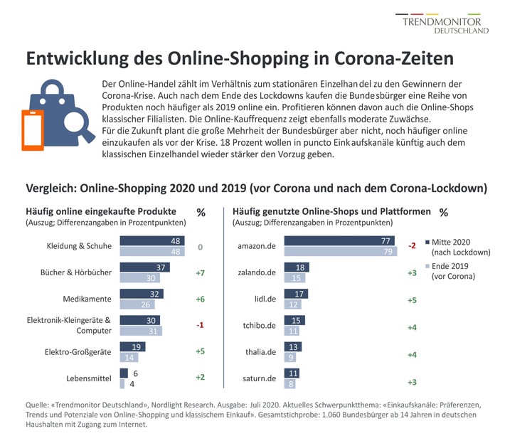 In welche Richtung entwickelt sich das Verbraucherverhalten nach dem Ende Corona-Lockdowns? Wird der Onlinehandel mehr als nur kurzfristiger Krisengewinner sein? Wie sieht es mit der aktuellen Konsumbereitschaft der Deutschen aus? Und worauf wollen die Verbraucher beim Shoppen zukünftig stärker achten? Diesen und weiteren Fragen ist die aktuelle Ausgabe des „Trendmonitor Deutschland“ des Marktforschungsinstituts Nordlight Research zum Schwerpunktthema „Online-Shopping und klassischer Einkauf in Corona-Zeiten: Präferenzen, Trends und Potenziale“ nachgegangen. 1.060 Bundesbürger ab 14 Jahren aus Haushalten mit Internetzugang wurden Ende 2019 und erneut Anfang Juni 2020 (vor Corona und nach dem Corona-Lockdown) repräsentativ zu ihrem Einkaufsverhalten und zu den präferierten Einkaufskanälen (online / stationär) befragt.