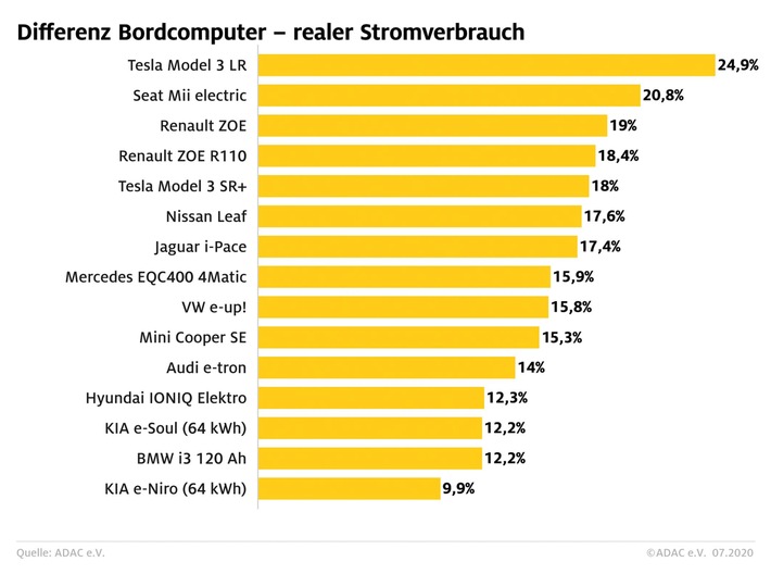 Ladeverluste addieren sich zusammen mit sonstigen Ungenauigkeiten von Bordcomputern zum Teil erheblich: So muss man beim Tesla Model 3 LR knapp 25 Prozent zur Bordcomputer-Angabe addieren, beim Seat Mii electric knapp 21 Prozent und beim Jaguar i-Pace gute 17 Prozent. Aber auch die Mittelklasse-Wagen Renault ZOE (knapp 19 Prozent), Nissan Leaf (17,6 Prozent) und VW e-up! (15,6 Prozent) zeigen ein deutliches Plus. Lediglich der KIA e-Niro (9,9 Prozent) bleibt unter der 10-Prozent-Marke.