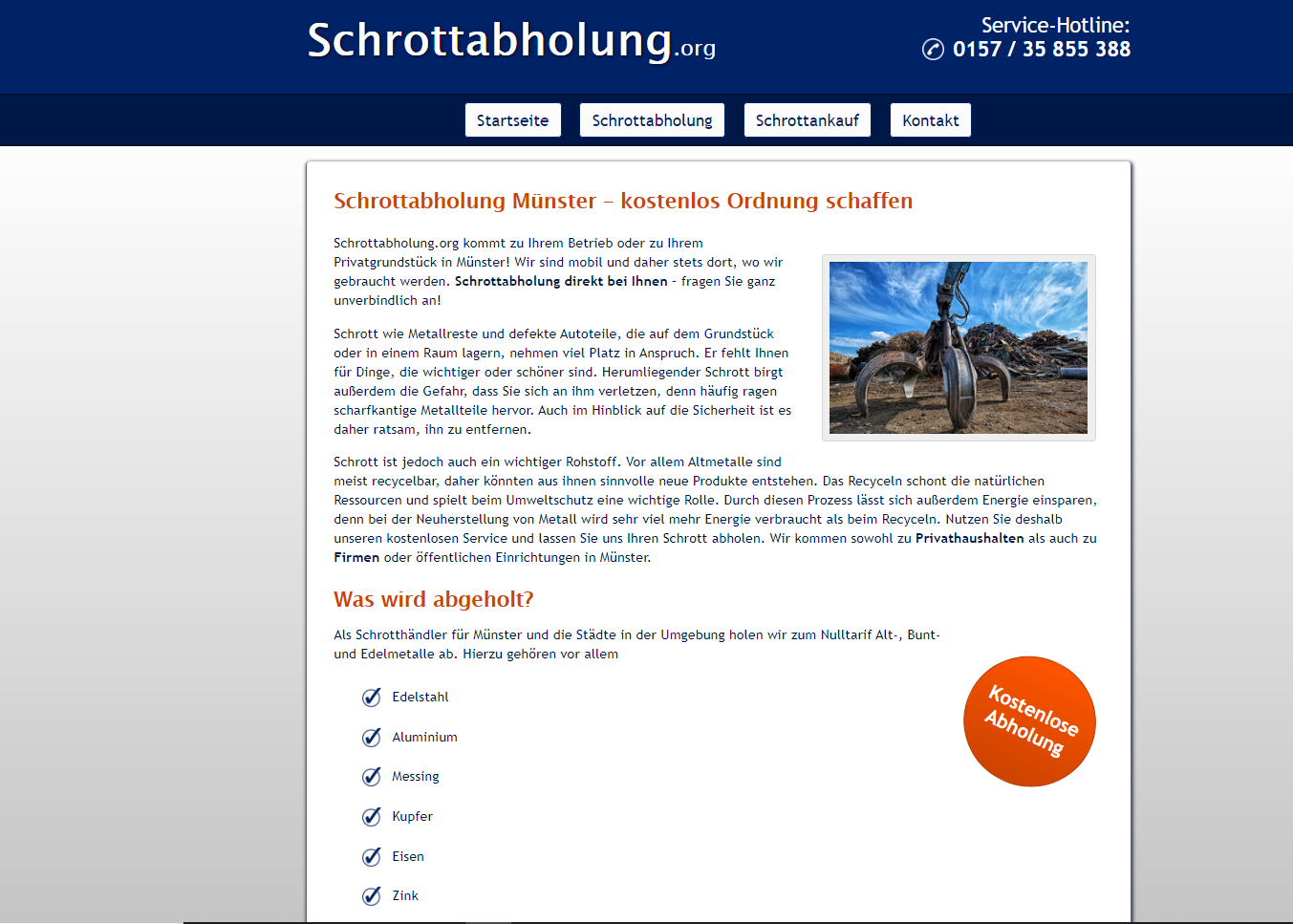 Sicher gibt es nicht nur einen Schrottverwerter in Münster. Schließlich besteht Schrott aus vielen wertvollen Rohstoffen, deren Recycling nicht nur dabei hilft, Ressourcen zu schonen, sondern die darüber hinaus auch von nicht zu unterschätzendem materiellem Wert sein können. Aus diesem Grund hat sich die Schrottabholung Münster dem Service verschrieben: Hier gibt der Kunde vor, wann es sein Zeitplan erlaubt, den Schrott abholen zu lassen.