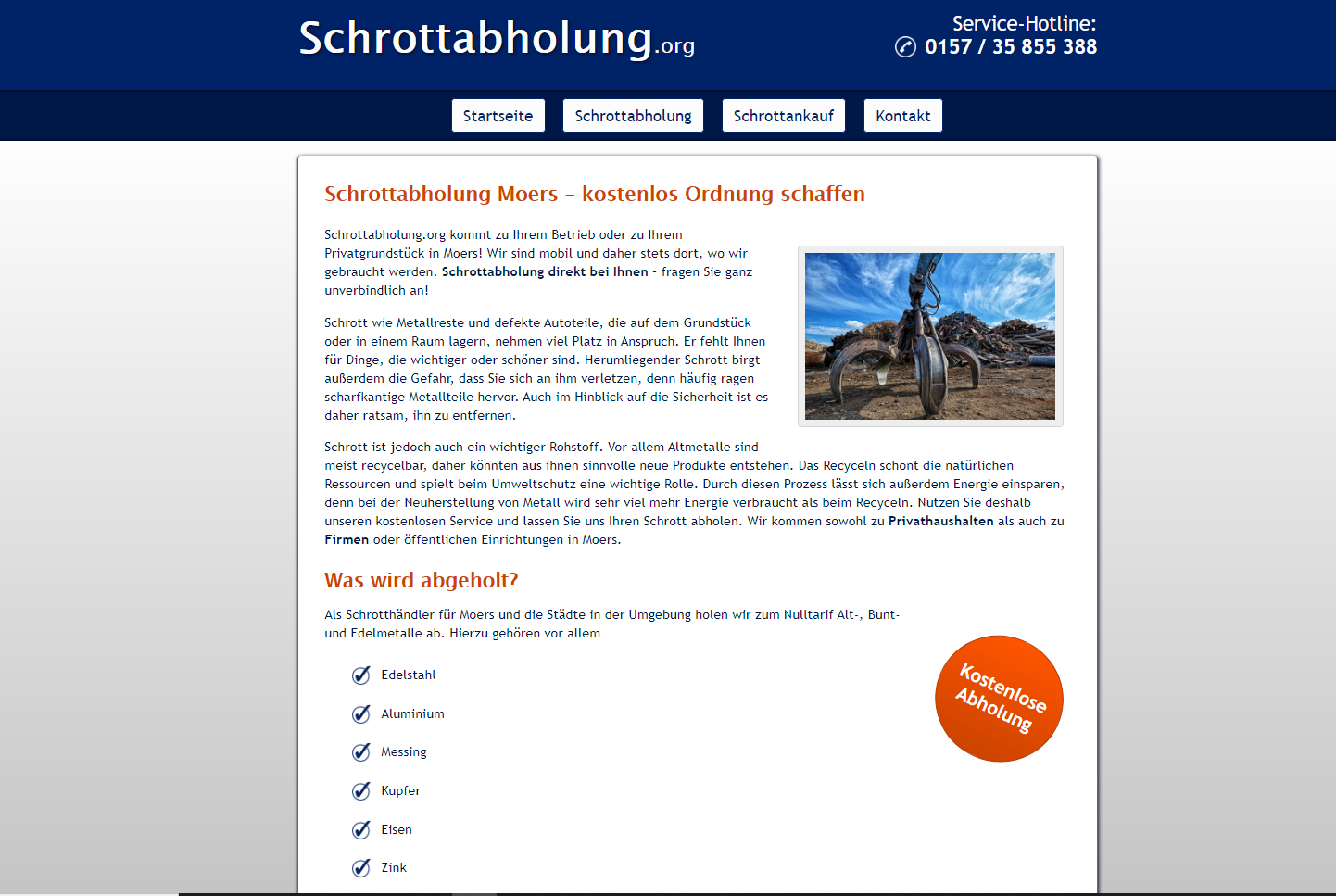 Die Schrottabholung Moers hat sich seit vielen Jahren einen sehr guten Ruf als vertrauenswürdiger Partner erworben, der Unternehmen und auch Privatpersonen bares Geld einbringen kann. Dabei ist es grundsätzlich so, dass die Kunden bei der Schrottabholung Moers natürlich für sortenreinen Schrott mehr Geld erhalten als für Schrott, der noch getrennt werden muss. Lohnenswert ist die Schrottabholung allemal für die Kunden und dabei ist die Abwicklung denkbar einfach: Sie müssen lediglich einen Anruf tätigen und angeben, um welche Art und Menge von Schrott es sich handelt. Am vereinbarten Abholtag wechseln Schrott und Geld die Besitzer und der Kunde kann sich außerdem darüber freuen, einen wertvollen Beitrag zum Umweltschutz geleistet zu haben.